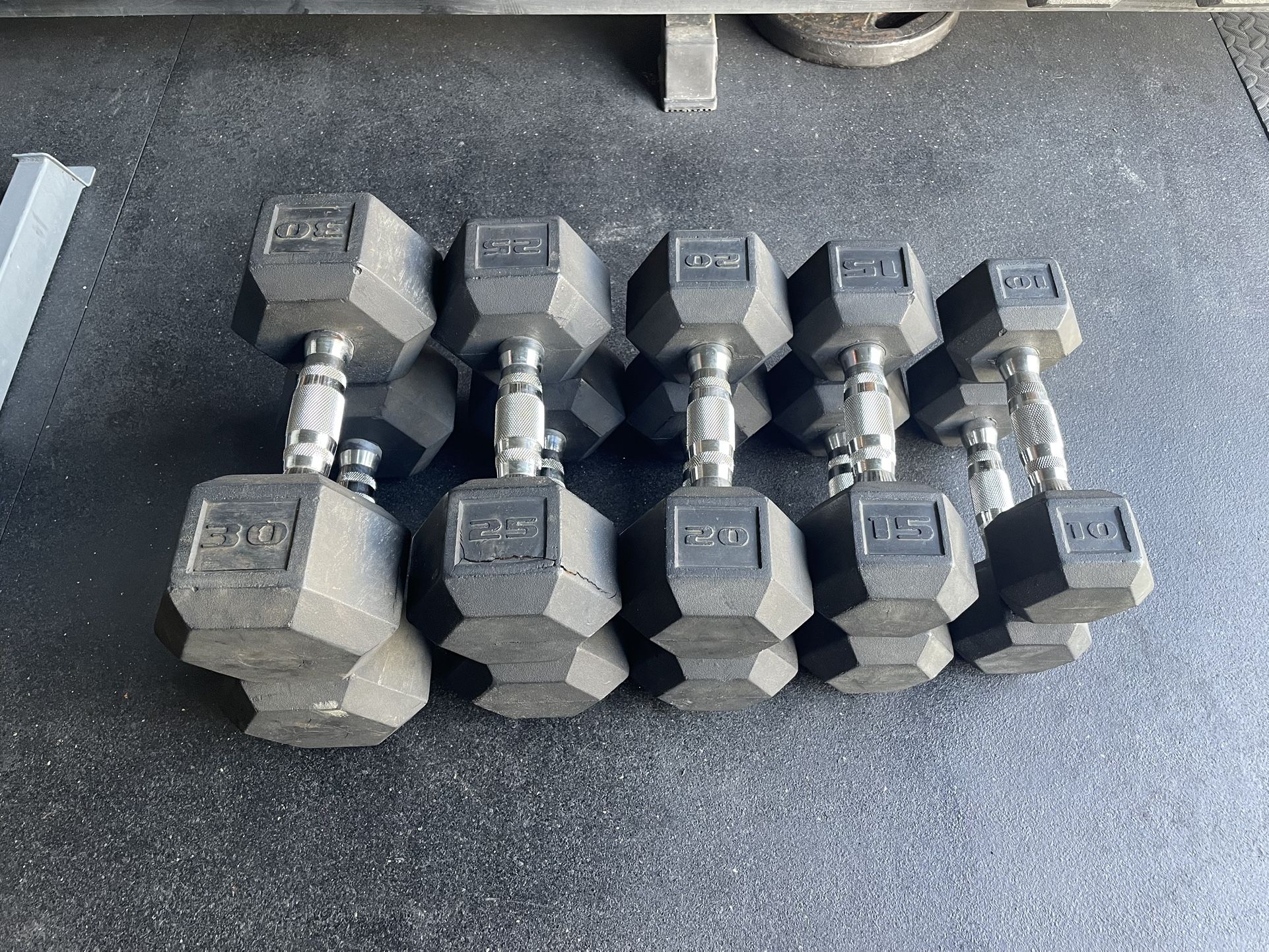 Hex Rubber Dumbbells… Home gym Fitness… One of the 25 lbs has a crack. 2 X 10 lbs 2 X 15 lbs 2 X 20 lbs 2 X 25 lbs 2 X 30 lbs 200 lbs Total. $150 Price is Firm!!!! Check out other items for sale: Olympic Barbell, Weight bench, Dumbbells, Kettlebells, Squat Rack, Functional Trainer, Boxing, Fitness, Exercise, Assault Air Bike, Health, Workout, Rowing machine…