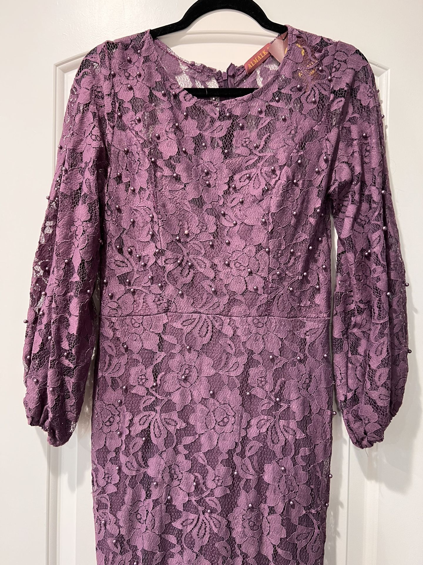 This dress has super great quality stretch lace with purple pearls sewn on. Amazing for an event!!
