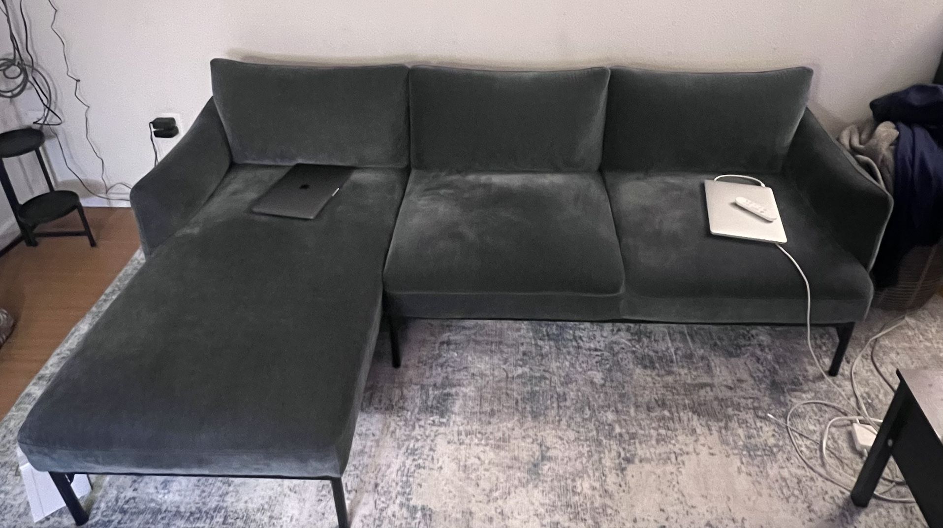 1 year of use, still in great condition. Separates into two pieces (sofa + sectional) Link added shows sofa version w/similar measurements. Sectional piece is about 50”.