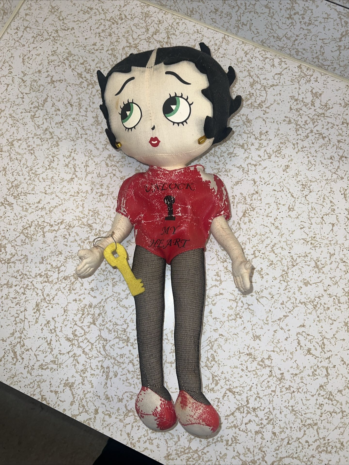 This Betty Boop plush doll is a must-have for collectors and fans alike. With a Valentine's Day theme, the 16.5" doll features the iconic character holding a heart with the message "Unlock My Heart". The doll is made from high-quality cloth material and is part of the Betty Boop Plush Dolls product line. The doll was manufactured in the 2000s and is in excellent condition. It comes with all the accessories shown in the pictures and makes for a great addition to any Betty Boop collection. Don't miss out on your chance to own this adorable plush doll. Some wear on feet
