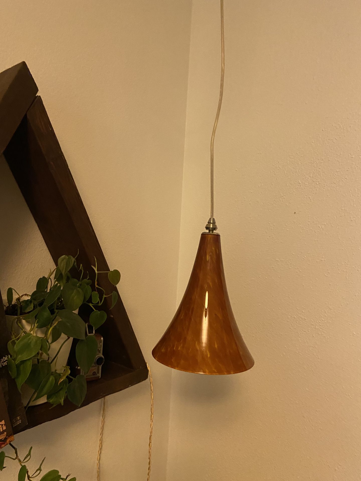 Mid century pendant light amber glass cone shade.
