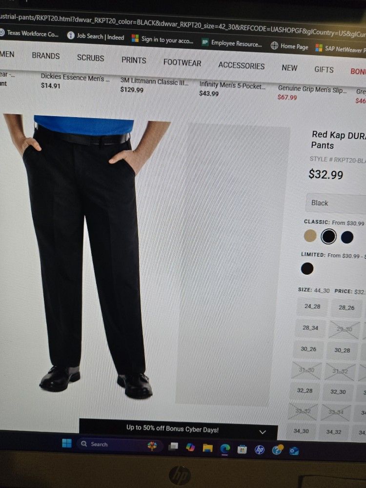 5 pairs of black (New ) Industrial work pants Size 44 waist by 30 length Relaxed fabric 65/35 polyester/cotton 15 dollars each Topperwien and kittyhawk area Cash