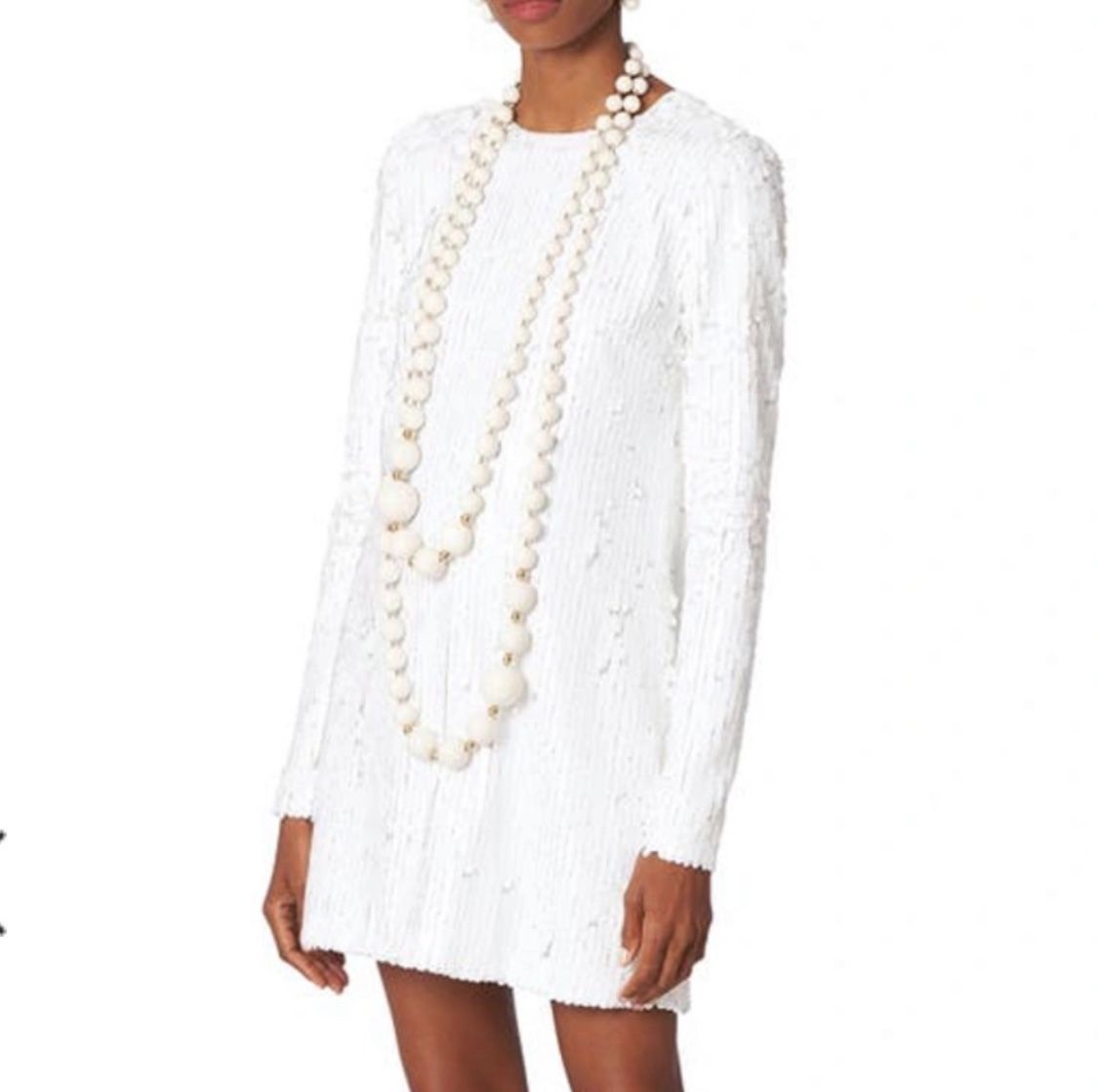 Dazzle in this chic long sleeve white shift mini dress. Features white Paillette sequins. Perfect for elegant or formal or party. Search words: bridal shower wedding engagement bachelorette party