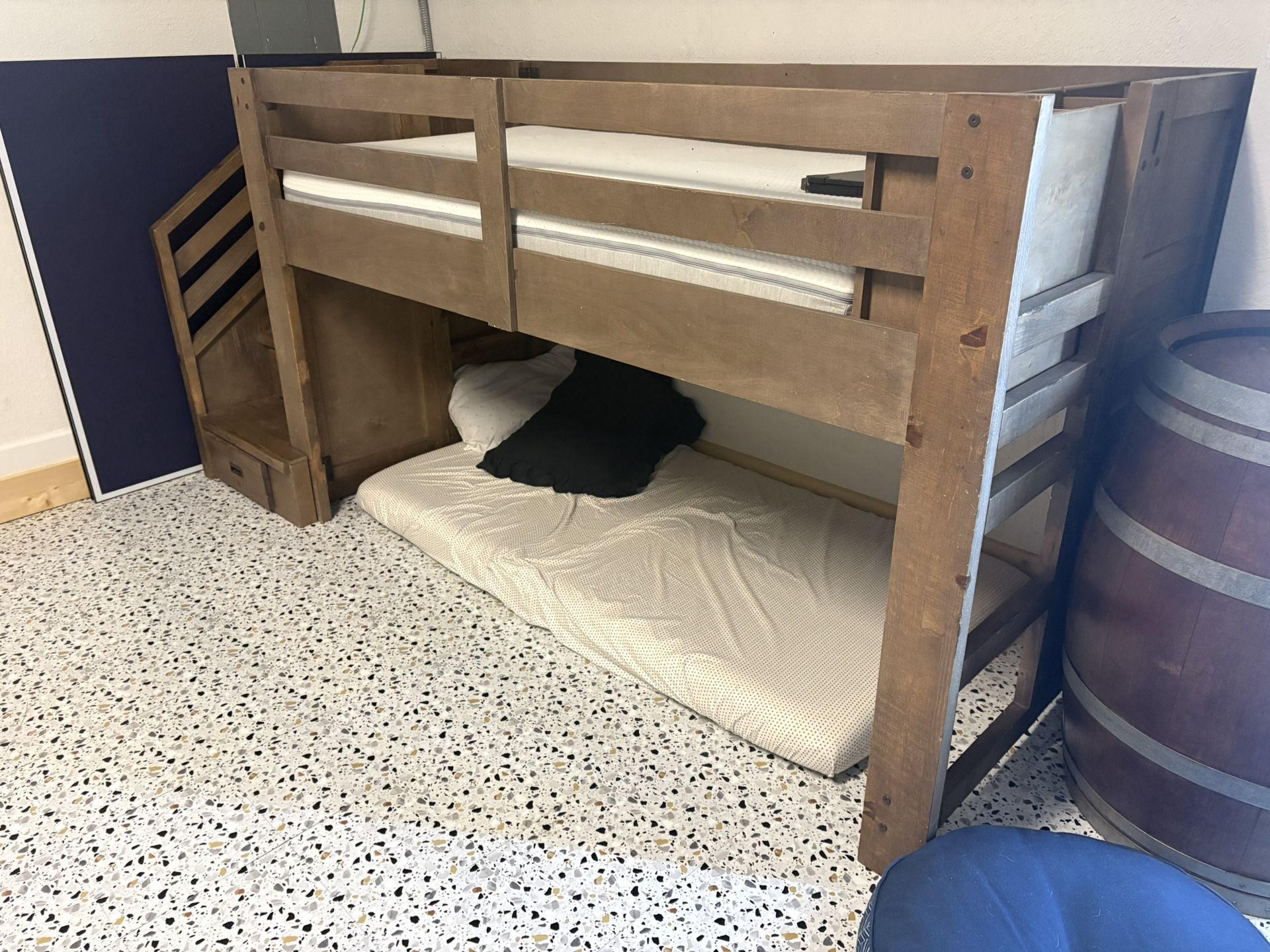 Very good condition Wood Bunk Bed Twin size with Steps and Drawers ideal for kids room, will include memory foam Matress, all for only $240