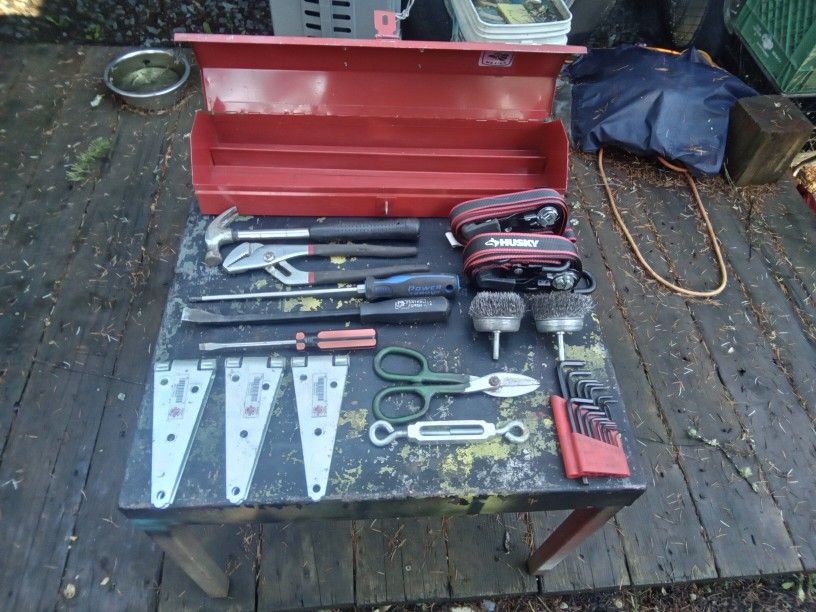 Small Heavy Duty Steel Toolbox And Assortment Of Shop Items, Great Condition. $10.00.