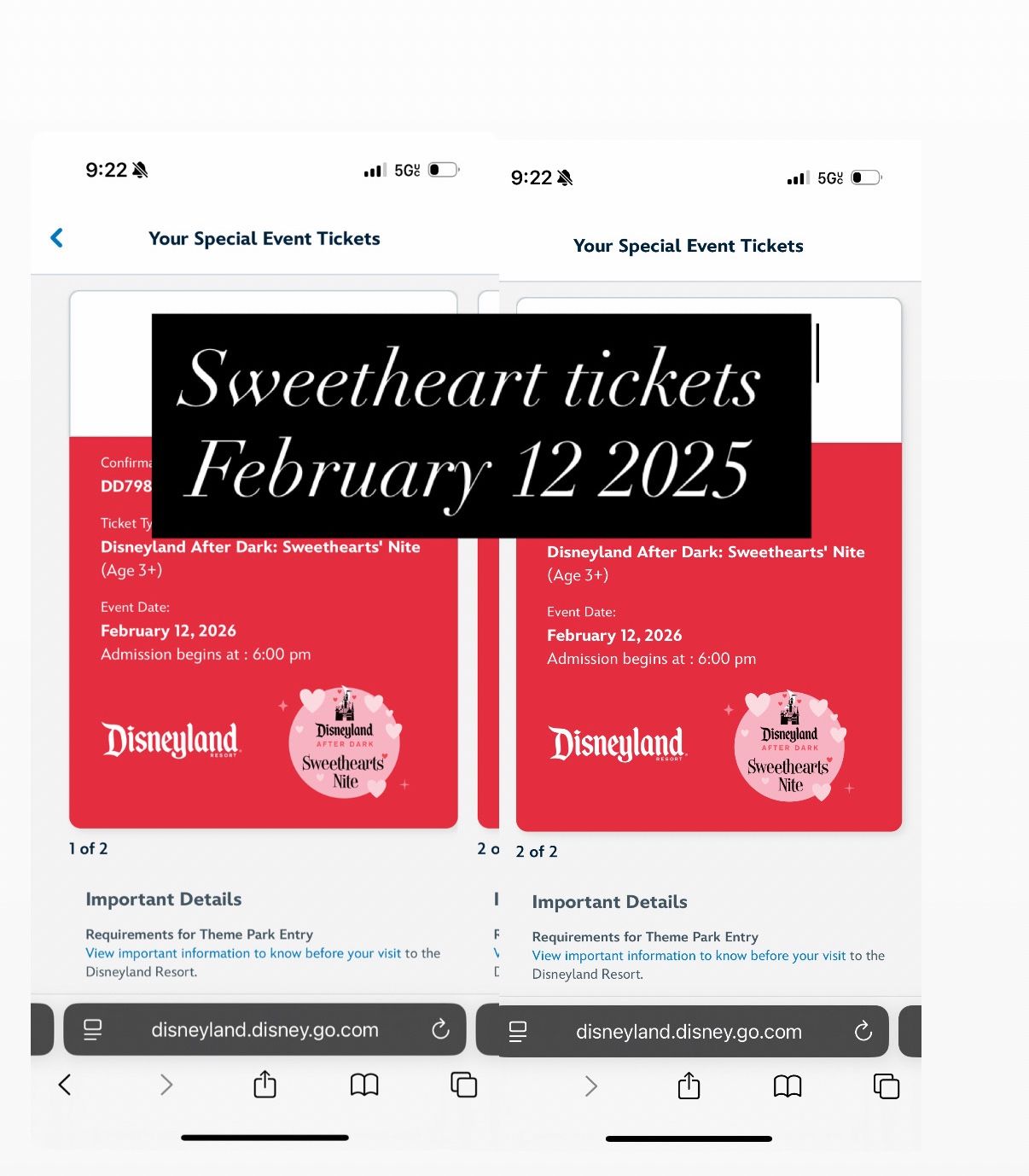 Meet up in person. I will transfer them over to your Disneyland app. And change the name FEBRUARY 12th Can no longer go $540 for both tickets PRICE FIRM