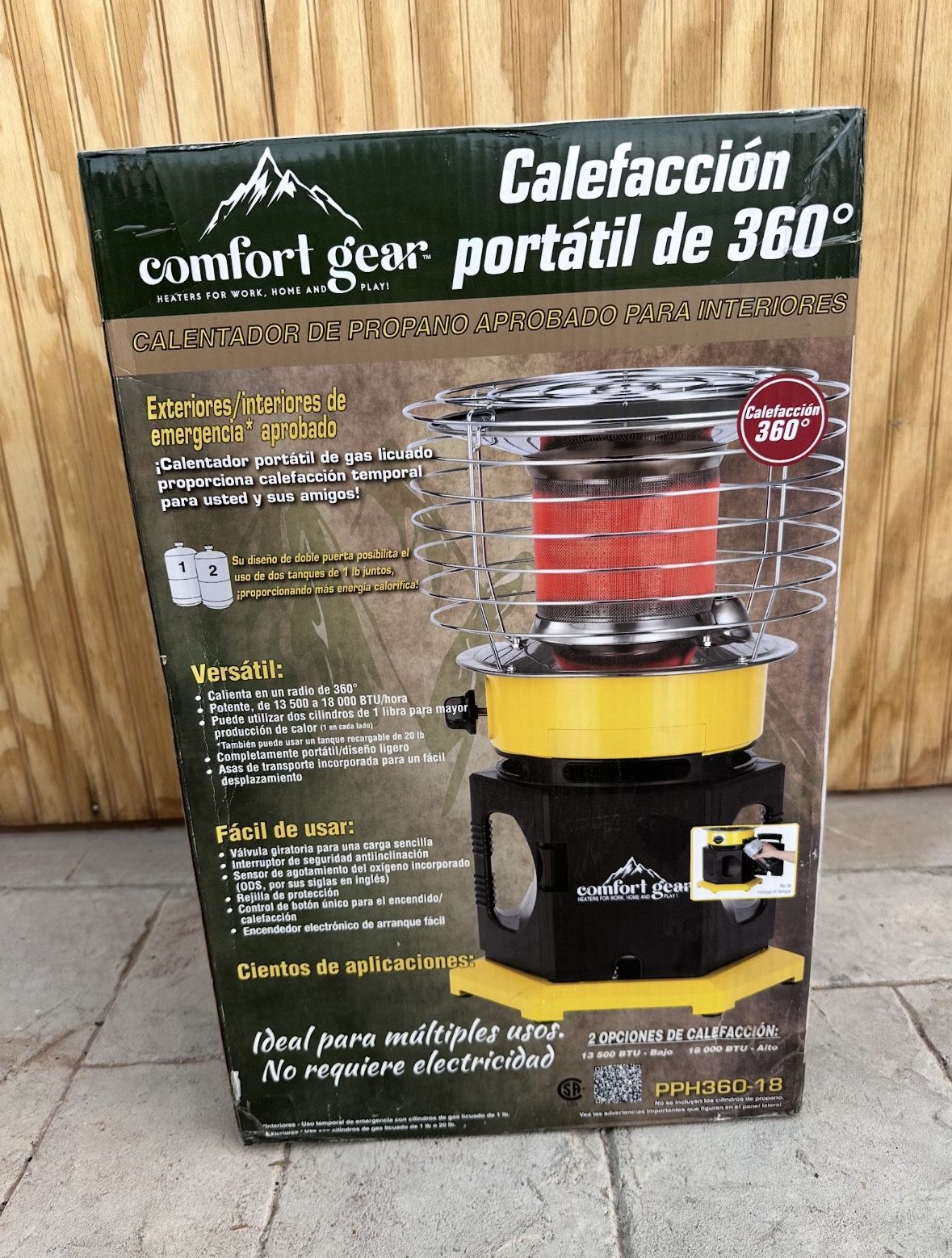 Brand New In box… asking $100 … Comfort Gear 360 Degree Propane Space Heater, 13,500 to 18,000 BTU Indoor/Outdoor Portable Radiator for 450 Square Feet with Handle, Yellow/Black