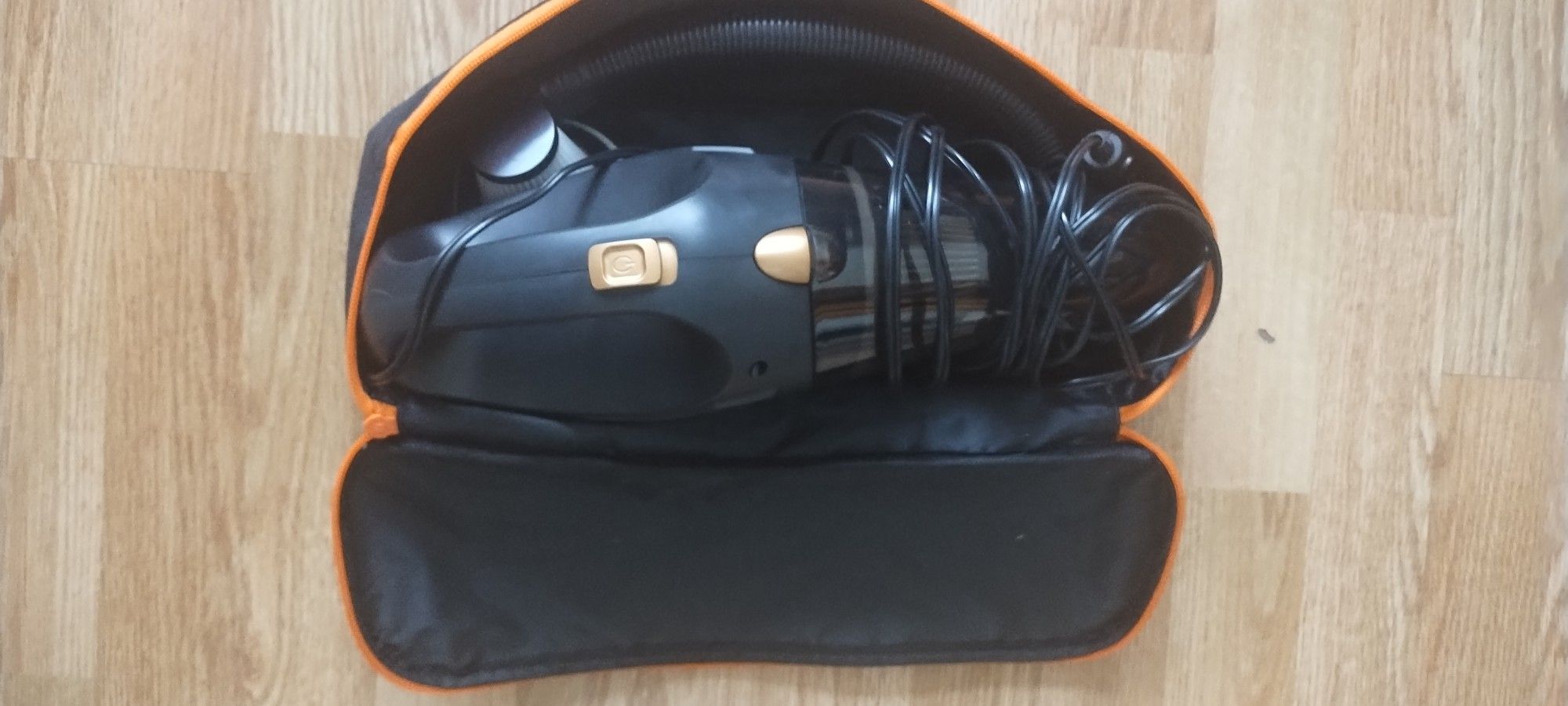 Small car vacuum that connects to 12 volt accessory plug in your car. Never used and has attachments. Works perfect.