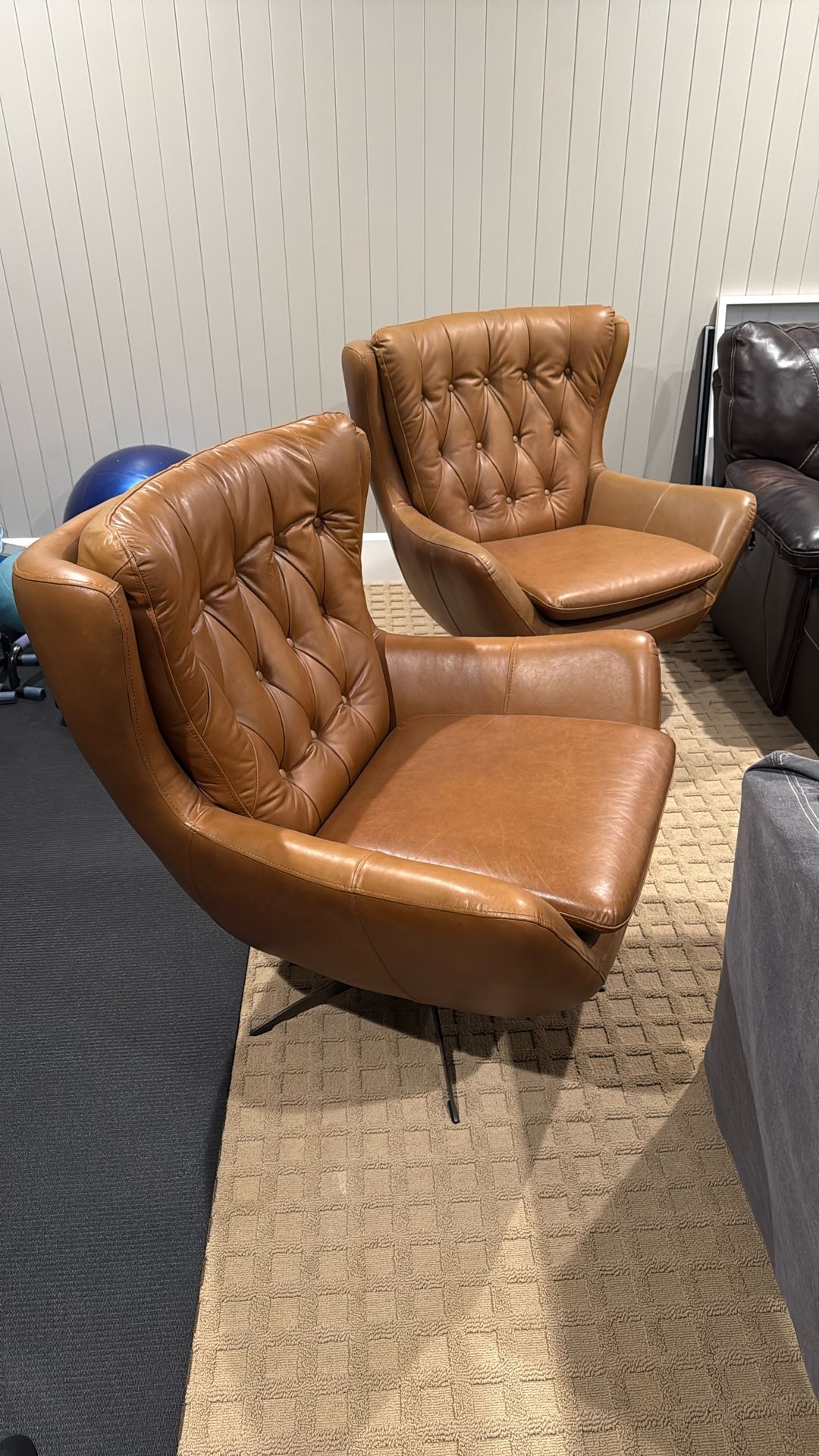 Look brand new barely used Swivel Reddish tan leather Super comfy! We love these chairs but we have no room for them