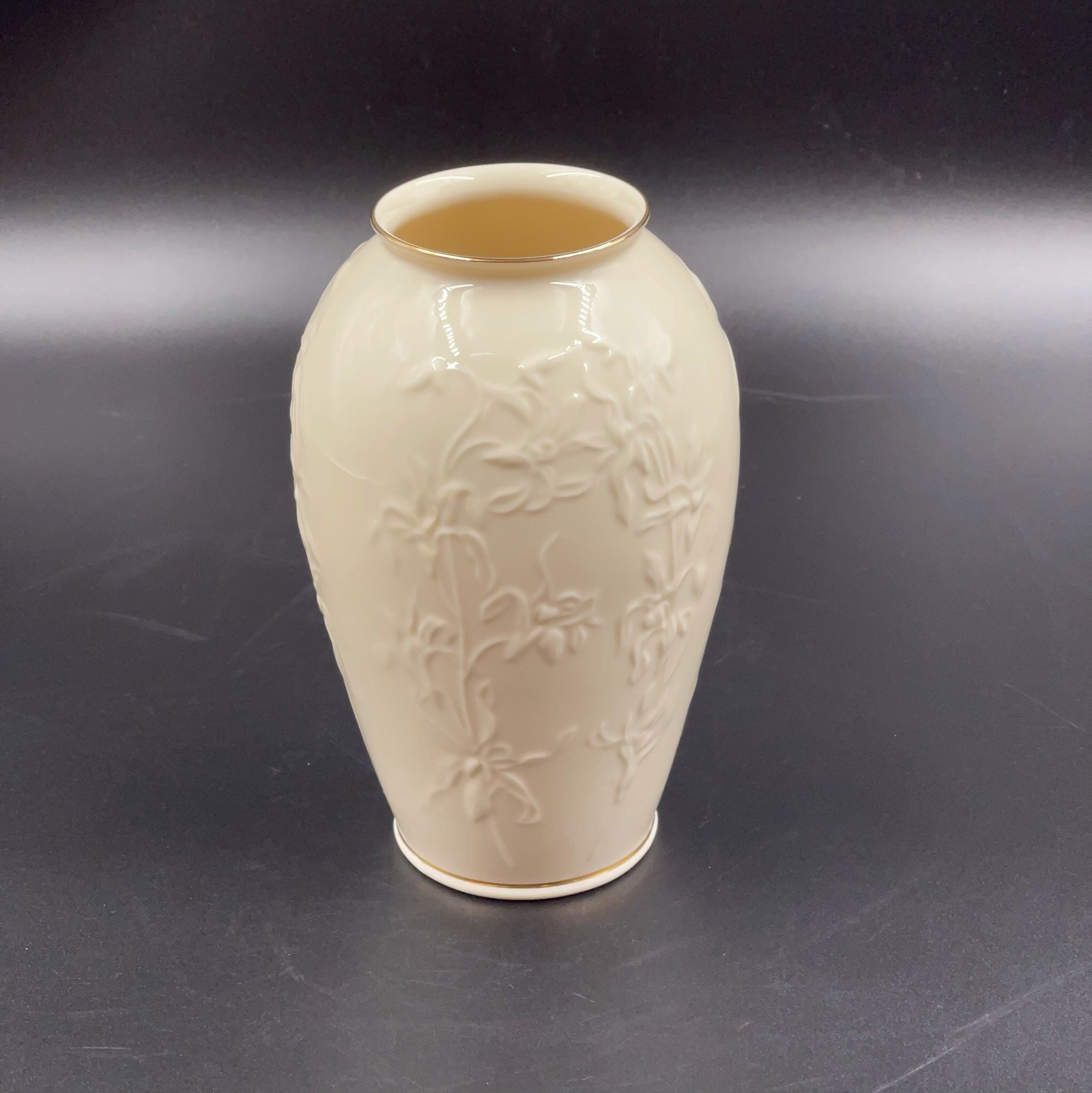 Here is an elegant vintage Lenox Iris Embossed Flowers Centennial 1(contact info removed) Vase Ivory With Gold Rim. Approximate measurement: 6 1/2 inches tall. Very good condition: no chips, cracks or repair.