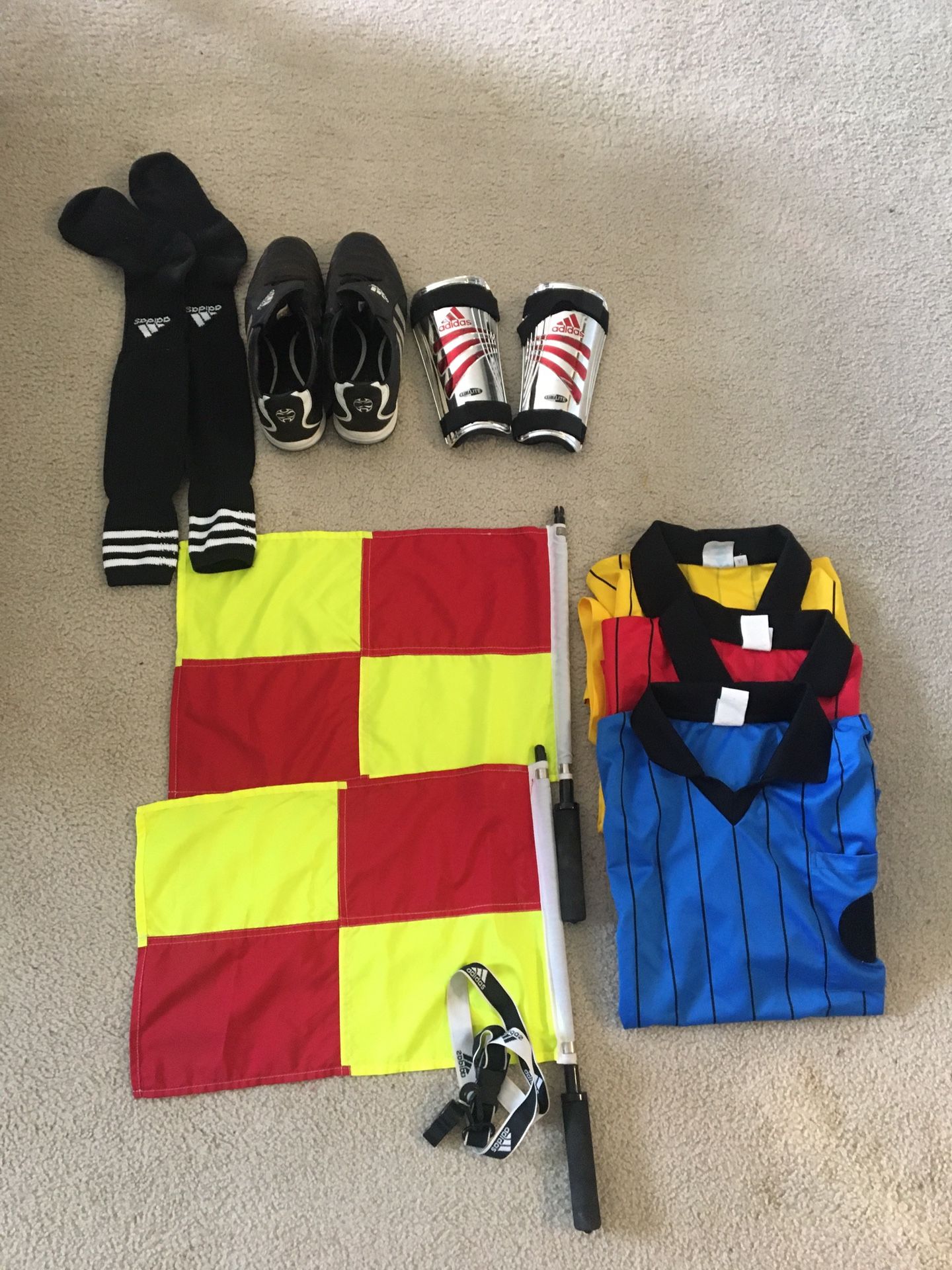 3 short sleeve jerseys Cleats man’s size 10 Shin guards Soccer socks High impact whistle Two referee flags