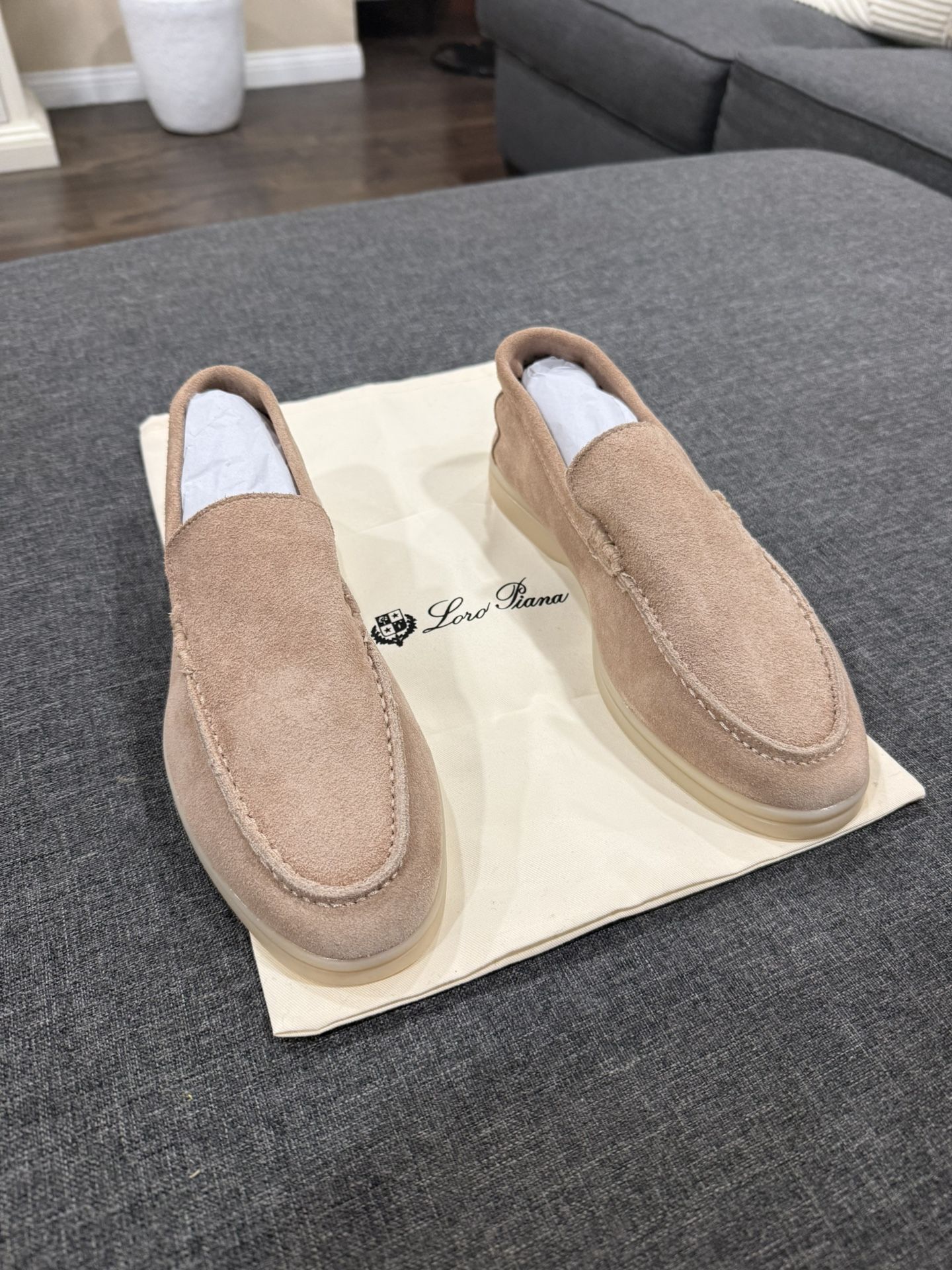 Men’s size 6.5 brown loafers in a Loro Piana Summer Walk style. Lightweight and comfortable, easy to slip on and wear all day. The neutral beige color makes them super versatile and easy to match with different outfits. Great for casual looks or adding a clean touch to everyday style.