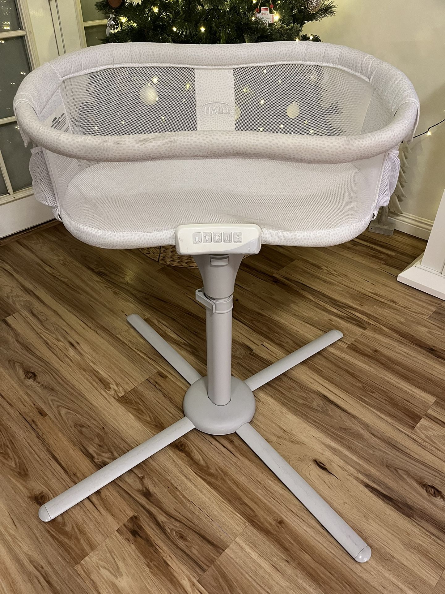 Halo newborn sleeper in good condition. Swivel with locking sides and foldable front bar for making it easy to put baby in/take baby out