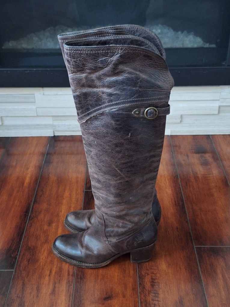 FRYE 77594 Jane Tall Foldover Boots Distressed Leather Heel Brown Womens 5.5 B, Pre-loved. In good condition overall. Please see photos for wear.