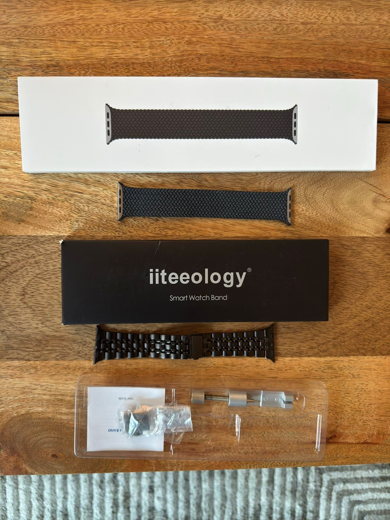 Selling 2 Apple Watch bands. One is the Apple Brand braided loop(midnight) and the other is a non Apple brand Black metal bracelet. Comes with tools to change out links on the metal bracelet.