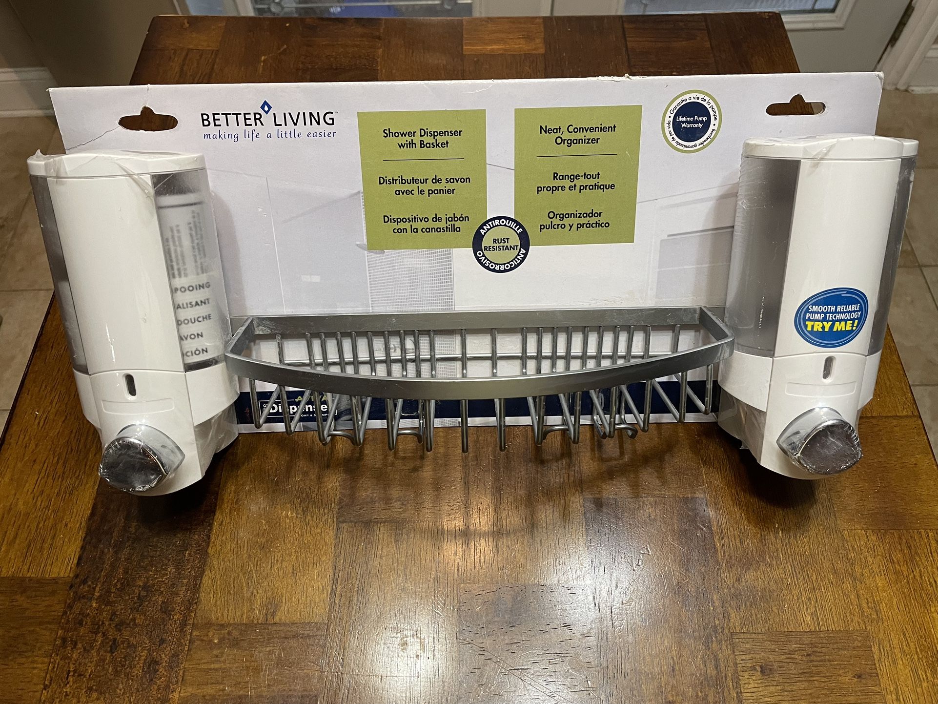 UNOPENED & NEVER USED forgot where we put it during our construction project. Dispenser has 2 towers for soap, shampoo, or conditioner and a nice basket wedged between for other shower supplies like your loofah, facial products, razors, etc… No tools needed, it installs with double faced tape and a silicone adhesive which are included. The product also has a lifetime pump warranty Unit measures 17.5” wide x 7.25” tall x 4” deep Each dispenser holds 11 oz of fluid