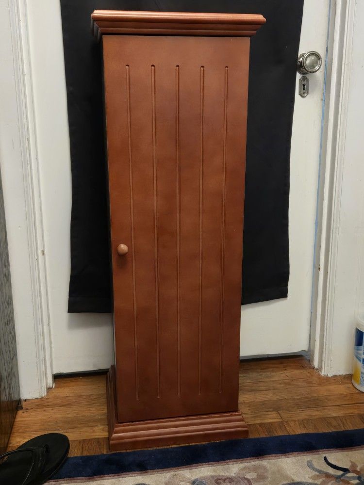 Cabinet swings away to open. This unit serves as CD/DVD storage as well as a handy side table and accent piece. It has a mahogany finish and stores up to 325 CD's or 144 DVDs. Shelves are height-adjustable to suit your needs. Dimensions: 38"H x 13"W x 11 3/4"D