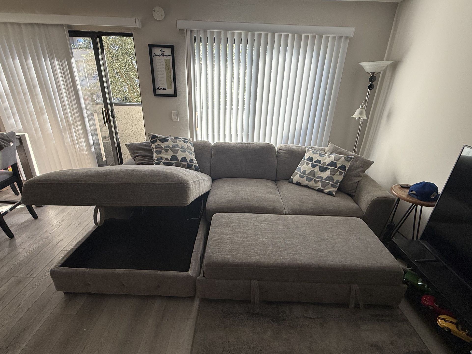 This couch is in amazing condition. It’s a two piece so it’s easy to move out. Folds out into a bed and has great storage. Need gone asap to clear out room for a pool table.