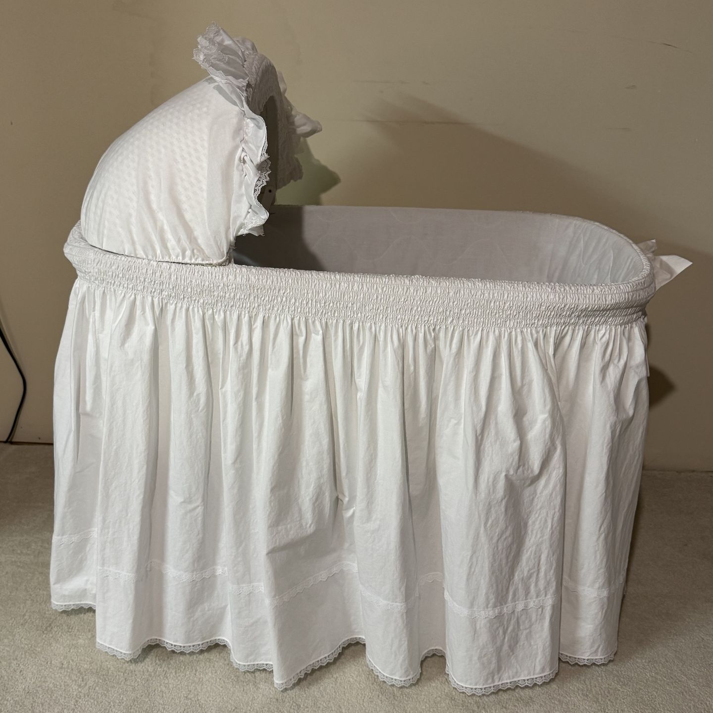 Bedding Includes: Skirt and hood (Bassinet not Included) Bassinet listed separately • Includes: Liner/Skirt & Hood • Fabric Color/Content: Poly Cotton • Machine Washable Fits bassinet that is 35" Long 18" Wide 27" Tall A True Compliment to Any Room! Lay your baby down in a wondrous haven of ruffles and lace for supreme elegance and comfort. The dainty bow at the center, lending this bassinet a unique flair that complements both traditional and modern decor. Lovely lace trims the smocked skirt and ruffled hood, creating the perfect setting for your little one! A pleasurable sight for any proud mom and dad!