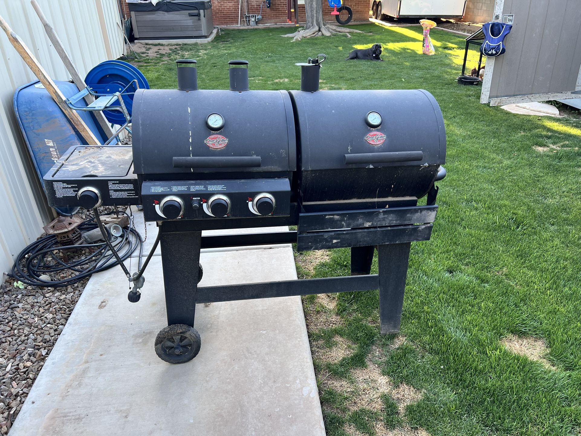 Duo play BBQ grill with side burner. Will come with smoker ring and coal chimney starter Does not have propane tank 100