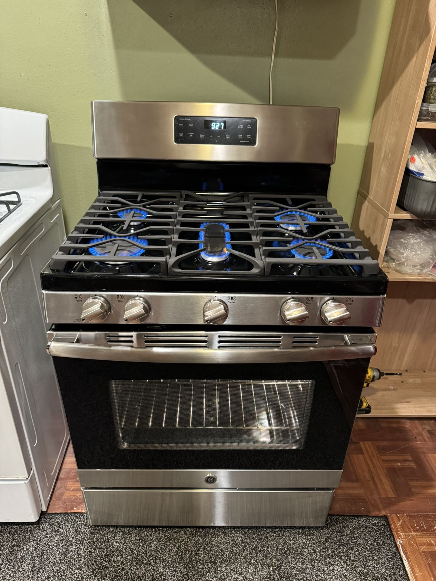 Estufa GE Stainless Steel en buenas condiciones y limpia lista para usarse los 5 quemadores y el horno le funcionan muy bien mide 30” de ancho y ya trae su manguera de gas lista para conectarse, entrega e instalacion a domicilio
