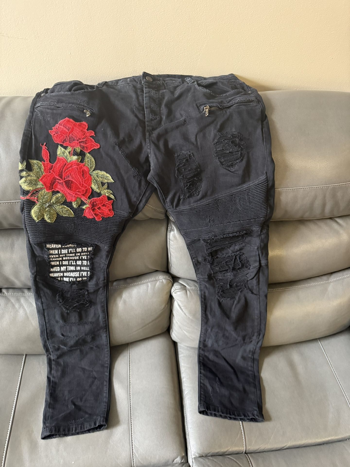 Black Denium with red rose 🌹 and white writing soze 38