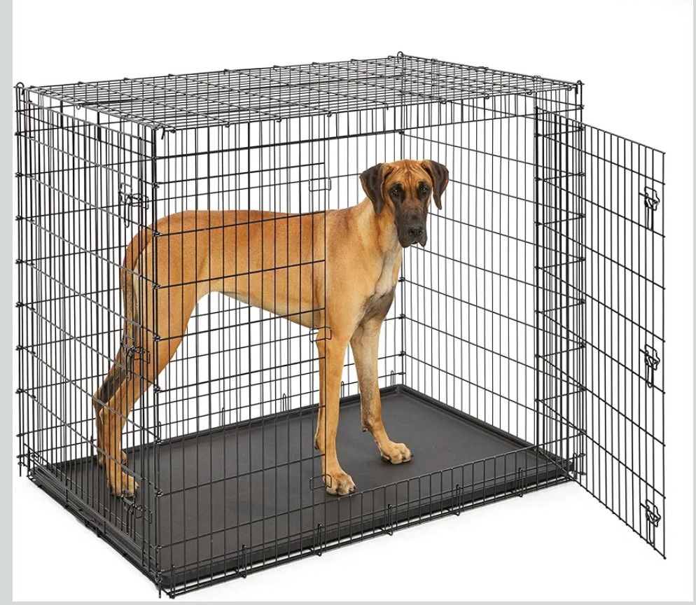 We've used this crate for a few months for our 75 lb German Shepherd and it's way bigger than he needs. We're getting a smaller one. Crate is in great shape. We'll break it down for transport. Suggest having two people to put it back together. 45" tall x 37" deep x 54" wide Sells for $226 new: https://offerup.com/redirect/?o=aHR0cHM6Ly93d3cuYW1hem9uLmNvbS9zP2s9NTQraW5jaCtkb2crY3JhdGU=