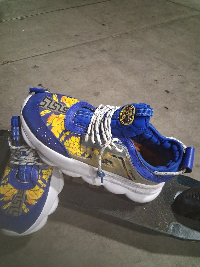 Blue white and yellow Versace Chain Reactions only worn once inside my house never touched concrete, they was a gift that will collect dusk, one man's trash another man's treasure!! I'm asking 250 considering they retail upbto 1,200 for this specific model only serious buyers plz