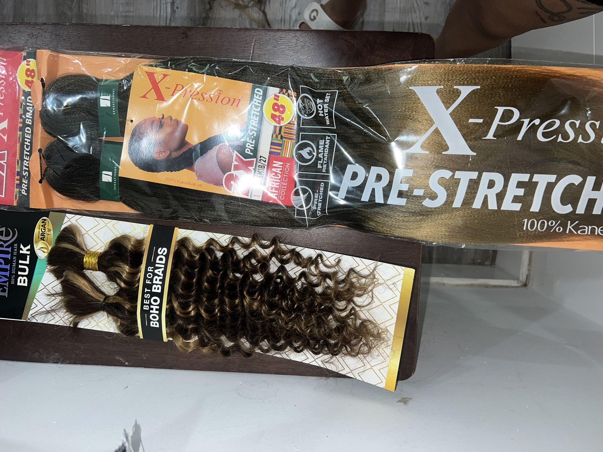 You get six packs of braiding hair with two bundles of BoHo braiding hair BRAND NEW NEVER USED - The BoHo braiding hair is 18 inches. Everything must go together price non-negotiable.
