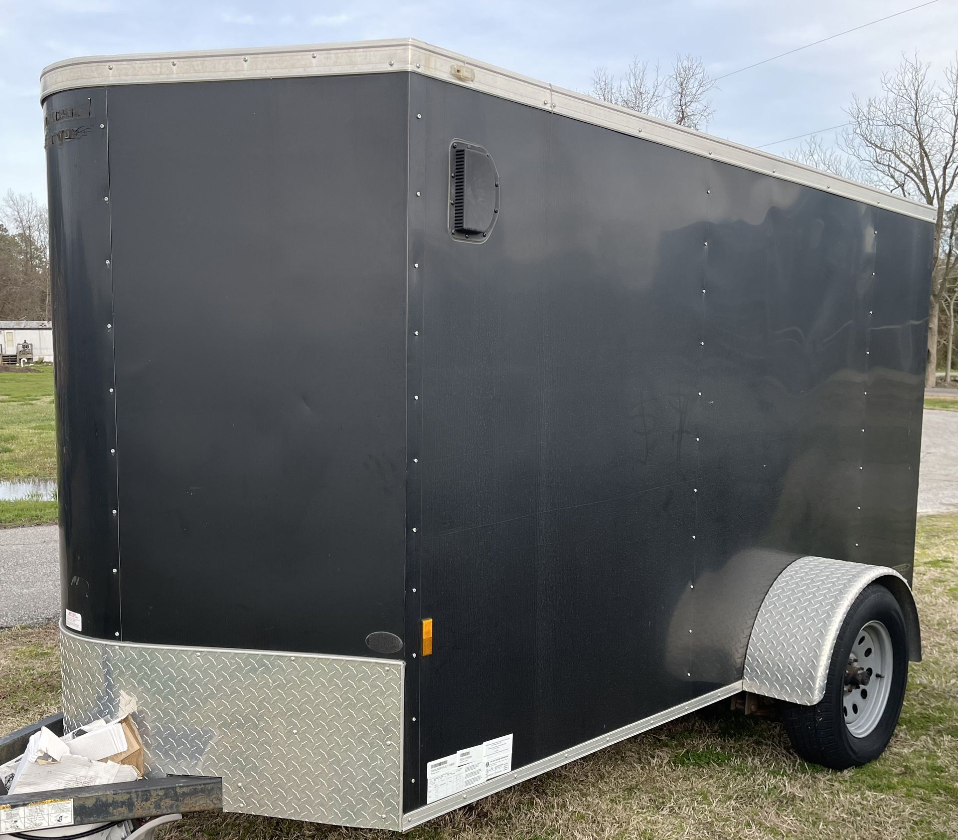 2019 enclosed trailer. Bought brand new two years ago and used it for storage and there are o ly less than 6000 miles on it. I installed a luxury vinyl tile on the floor and has been well taken care of. It still looks brand new inside and the outside has no damage and no problems at all. Trailer back comes down to ramp. Very nice. Lights inside all lights on the trailer work great. It’s basically brand new except the minor weathering that comes from being stored outside.