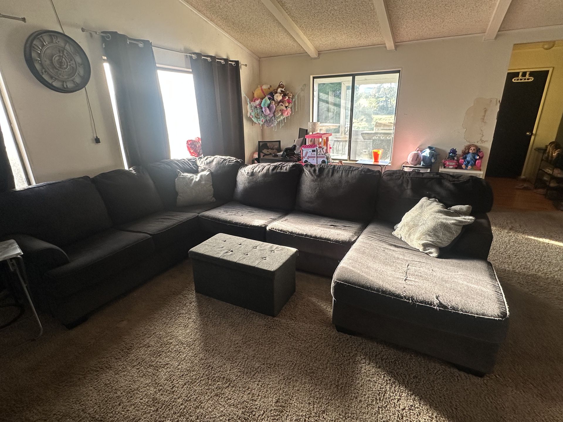 Few rips in fabric , (pictured ) but other than that great condition. Black color, right chase lounge . Sturdy and comfy