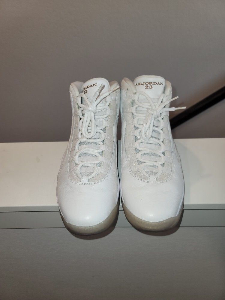 The OVO x Air Jordan 10 Retro 'White' received a super limited quickstrike release at an OVO. The design features a premium summit white leather upper with metallic gold stingray skin overlays, and a gold speckled translucent outsole. A limited number re-released in September of 2015