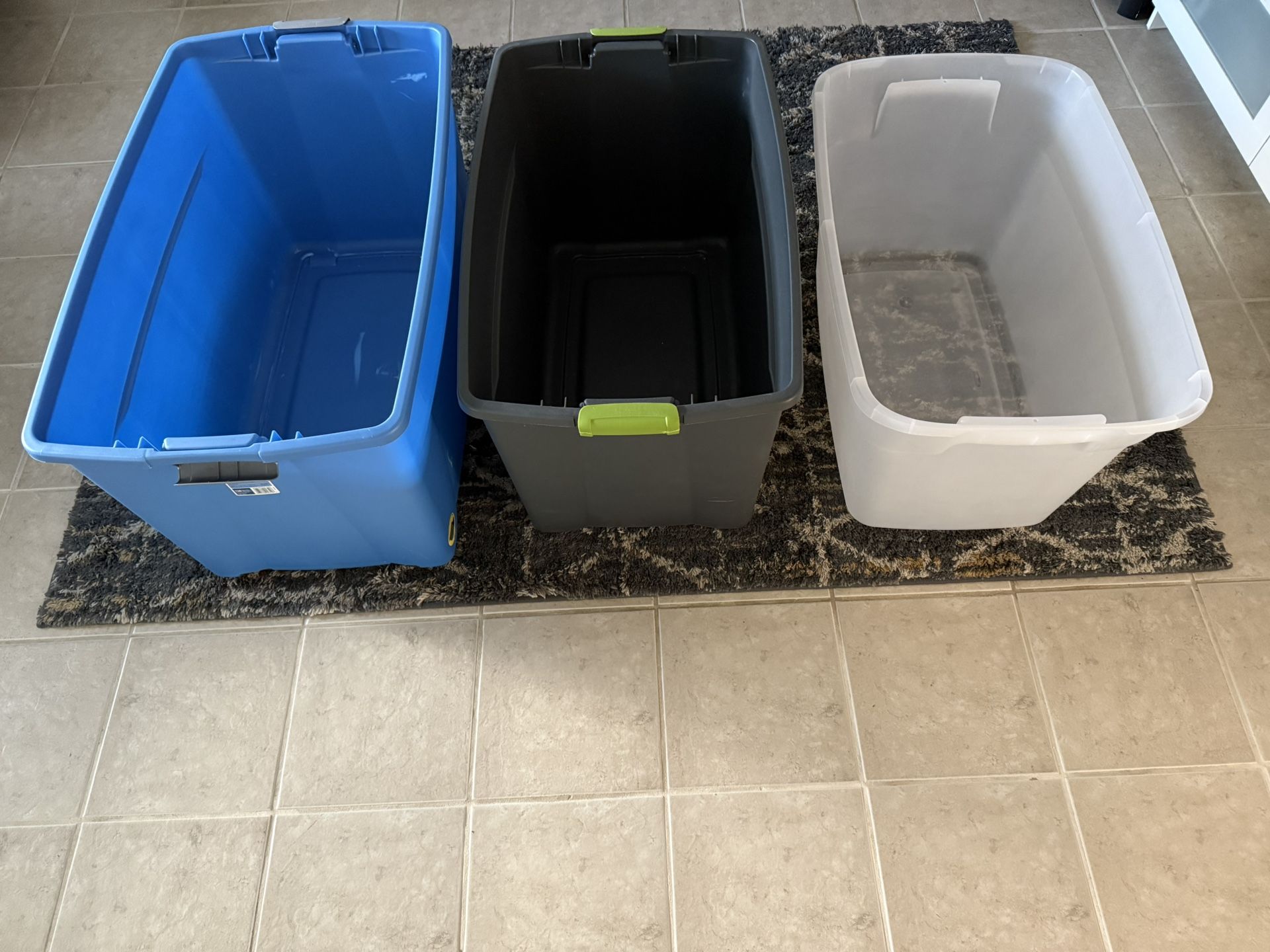 Three larger storage bins or totes with lids. In good condition, just downsizing. Largest is 45 gallons and has 2 wheels and other 2 are a bit smaller no wheels. Price is for all 3
