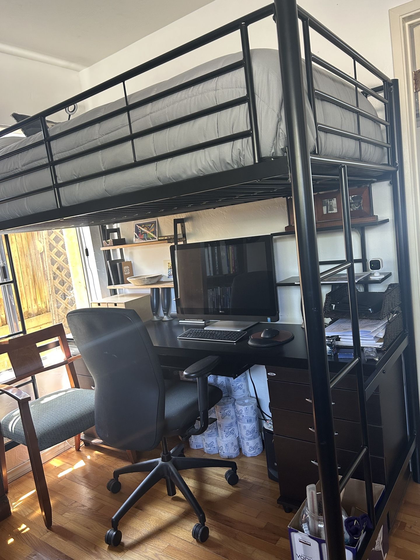 Very nice, like new, solid metal Loft Bed with a Desk below: $400 Matching drawer systems that slide on each side under the desk: $50 Nice Twin Mattress, (barley used): $50