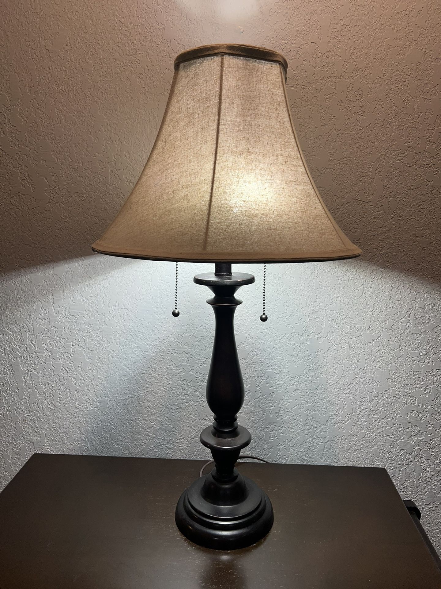 Nice table lamp with dual pull chains. Dark bronze color. Good working condition. ~28” high from base to top of finial. Pickup in Woodland Park
