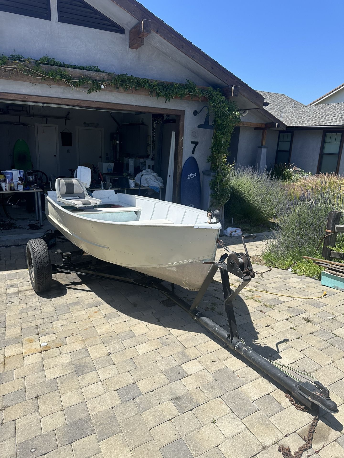 NEW EVERYTHING. All new bench seats, new transom, new beach launching wheels, new gas tank. 9.9 evinrude motor is in perfect condition, great compression, new spark plugs, new points and condensers, new water pump with less than 5 hours on everything. Starts first pull every time. Always flushed out after use. With four guys it will get on plane with no issue. Fresh paint inside and out, no leaks. Comes with an anchor and rope, plus another grey seat like the one pictured. Trailer has new lights and wiring, and greaseable bearings. Pulls like it’s not there. There are some cons, but only a few. Both the boat and trailer need to be registered, it’s an easy and cheap process, probably under 150$, but not something I have gotten around too yet. I am willing to knock the price down a bit if it isn’t done by the time it sells. Also the trailer could use new tires, also cheap. The current ones have some cracks. They hold air and tow just fine though. All in all it’s a great boat, perfect for lake or ocean days this summer. I want to get rid of it soon as I am moving, so shoot me offers please!
