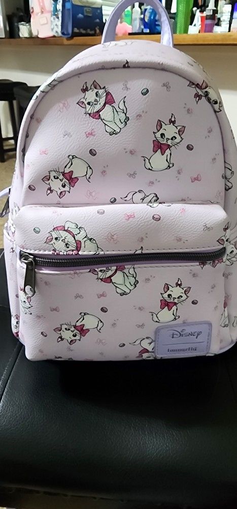 Loungefly Disney Aristocats Marie Pastel mini backpack. Carry everything you might need to not start fights with this purple mini backpack from The Aristocats. Printed all over with your favorite white kitten, Marie, in carious poses with macaroons and roses in the background. Featuring a front zipper pocket, 2 side pockets, top zipper closure, adjustable straps and carrying handle. 9 1/2" x 6" x 10 1/2" Polyurethane Is in excellent used condition, has flaws see last pic for details. And bottom is slightly dirty. **No trades, please don't ask. Smoke free home. ALL REASONABLE OFFERS ARE CONSIDERED. Check out our page for many more great and unique items.**
