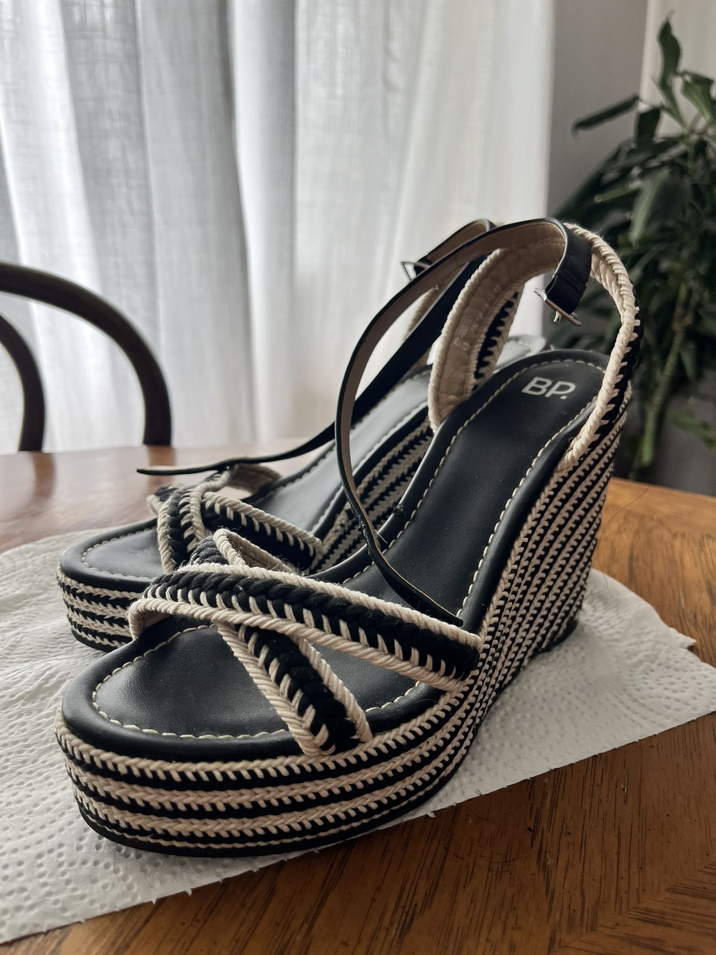 Very cute wedges worn only twice. Size 8. 4” heel and 1” platform. There is slight peeling (see pictures).