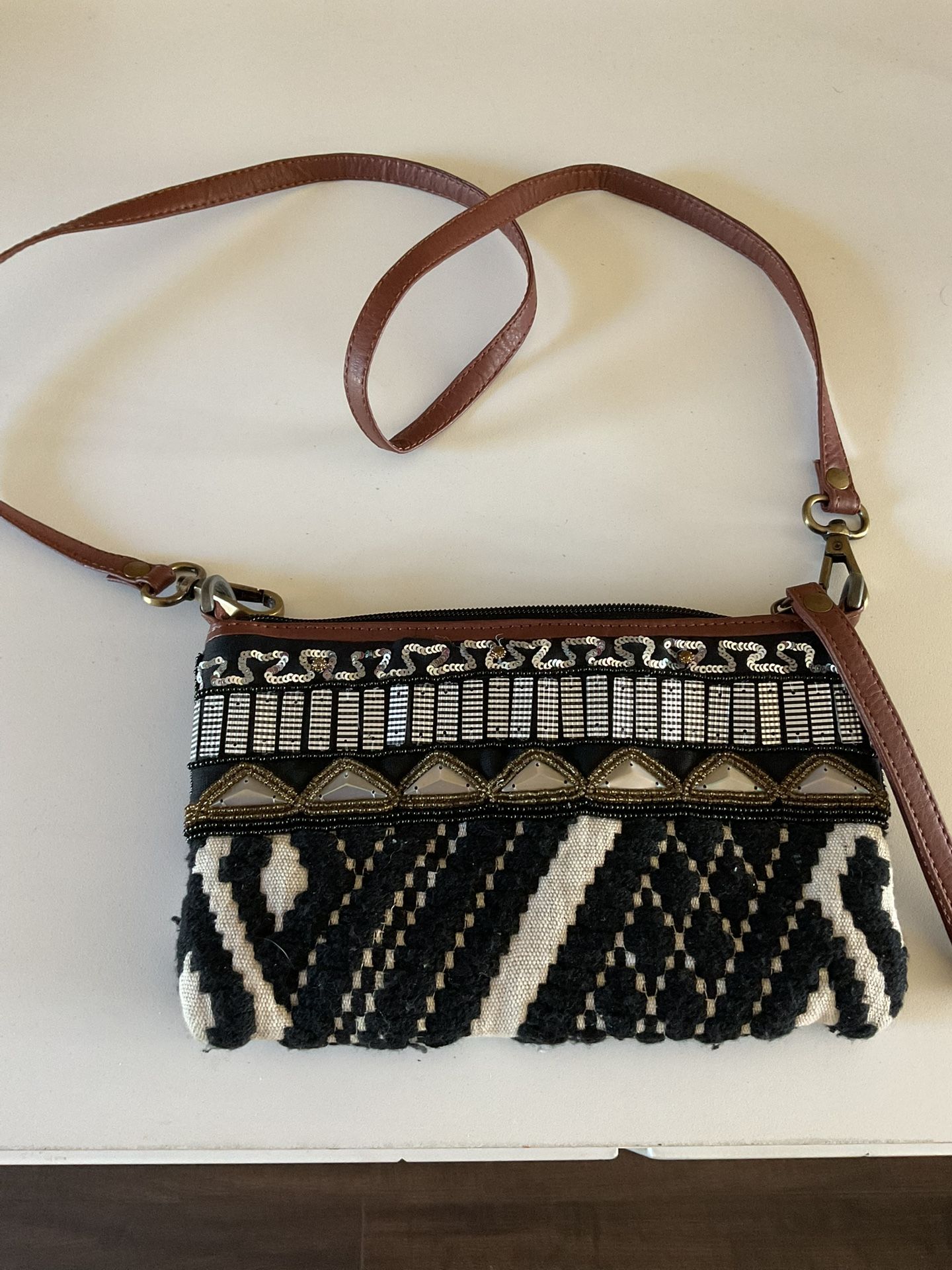 Pretty, black and white geometric/Aztec design woven cross body purse with beading and sequins. Brown leather strap. 5”x8”. Made by Serra. PU in Temecula. Cash only.