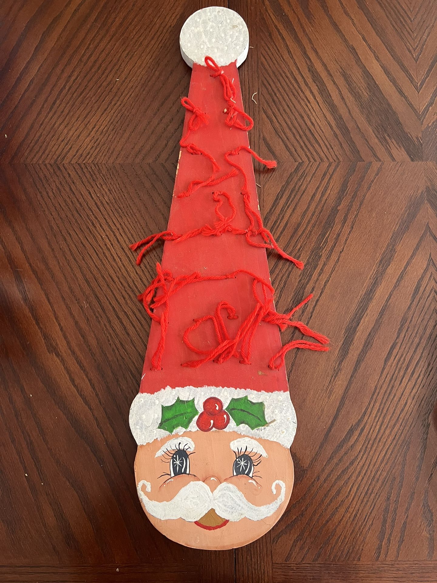 Santa wall plaque tie small candy canes on wood plaque and take one off each day until Christmas one complete one needs ties added one needs painted and finished