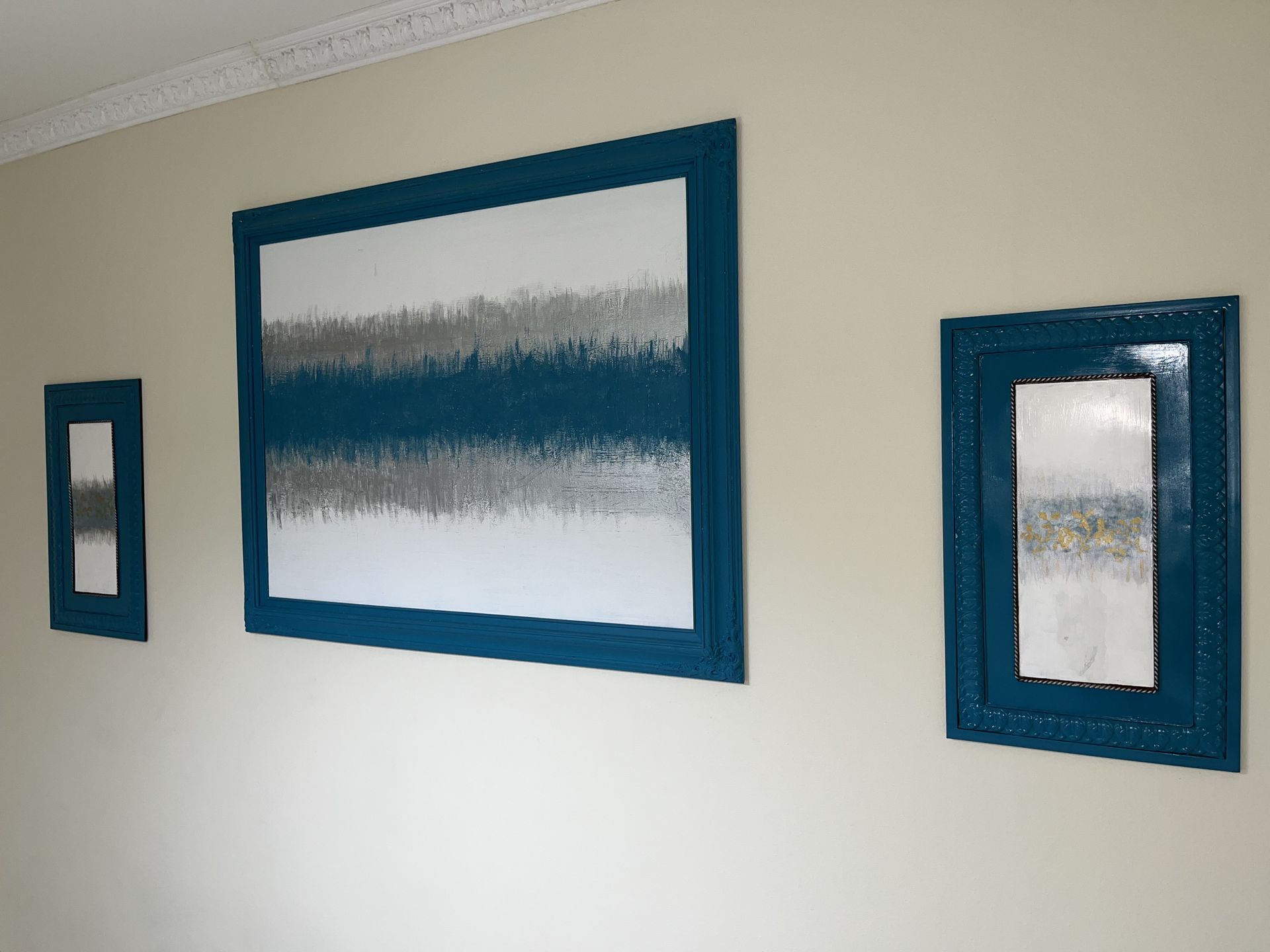 Modern abstract wall art set in teal/blue tones. Includes: • 1 large framed piece – 56 × 44 inches • 2 matching framed pieces – 18 × 30 inches each • Small pieces have metal frames; large piece has a wood frame All pieces are in good condition with normal wear on the back only. Fronts are clean and look great once hung, Perfect for a living room, stairway, or entry accent wall. Selling as a set. Pickup only. Cash or Zelle only.