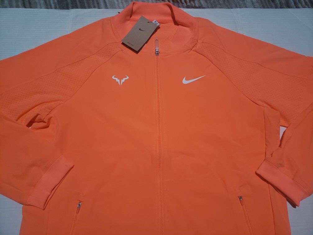 Elevate your activewear game with this Men's Nike Dri-Fit Rafa Nadal Tennis Jacket in Bright Mango. Designed with a mid-length and a full zip closure, this jacket is perfect for all your tennis needs. The jacket features zipped pockets, lightweight material, stretch, moisture-wicking, and breathability, making it perfect for summer, fall, and spring. The jacket is made with polyester outer shell material and polyester lining material. It is machine washable and comes in a regular fit, making it perfect for any occasion. The jacket is part of the Nike Rafael Nadal product line and is solid-patterned with the Snike character. It is available in size XL and is perfect for men who love sports and activewear