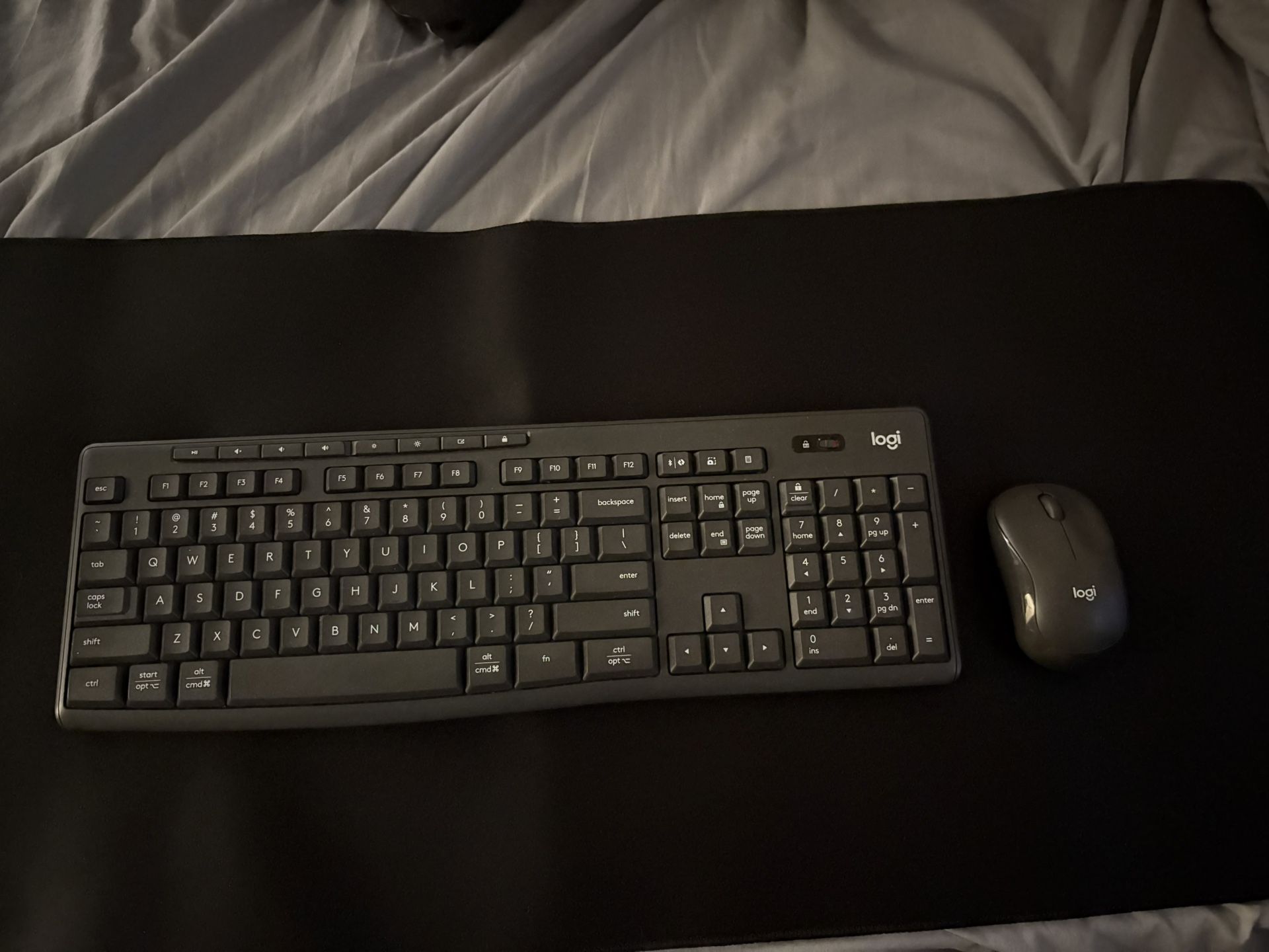 Wireless black keyboard set includes -black mat -black wireless keyboard -black wireless mouse - Bluetooth device to plus into computer. Please contact me with questions and God bless.