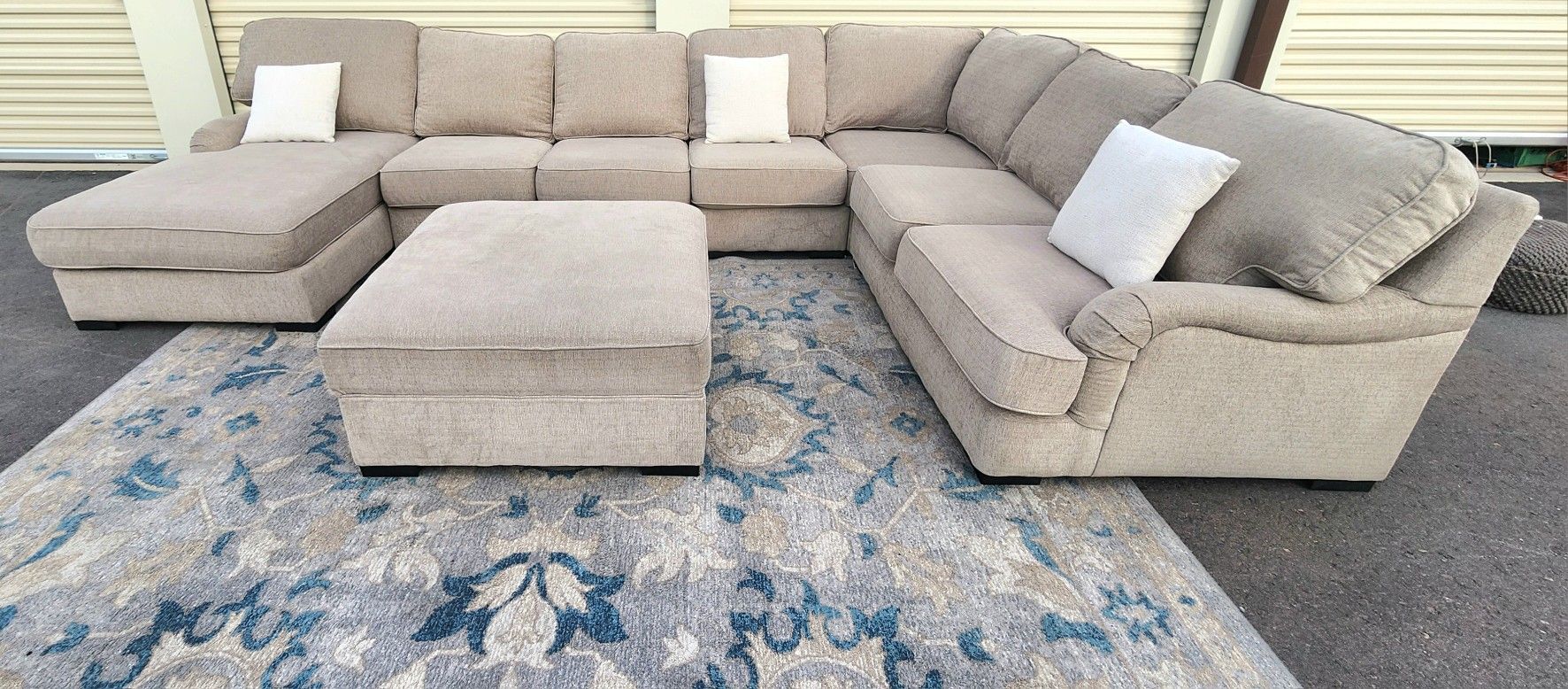 Large Ashley Beige Sectional Couch. Woven beige fabric. Tufted and tucked armrests. Removable and Reversible cushions and pillows. Ottoman with storage. Extra spacer piece that can be moved left or right. Dimensions: 155" x 98". Spacer seat is 26" long. So if you wove it to the right, it will be 130" x 124". Pickup in Avondale.