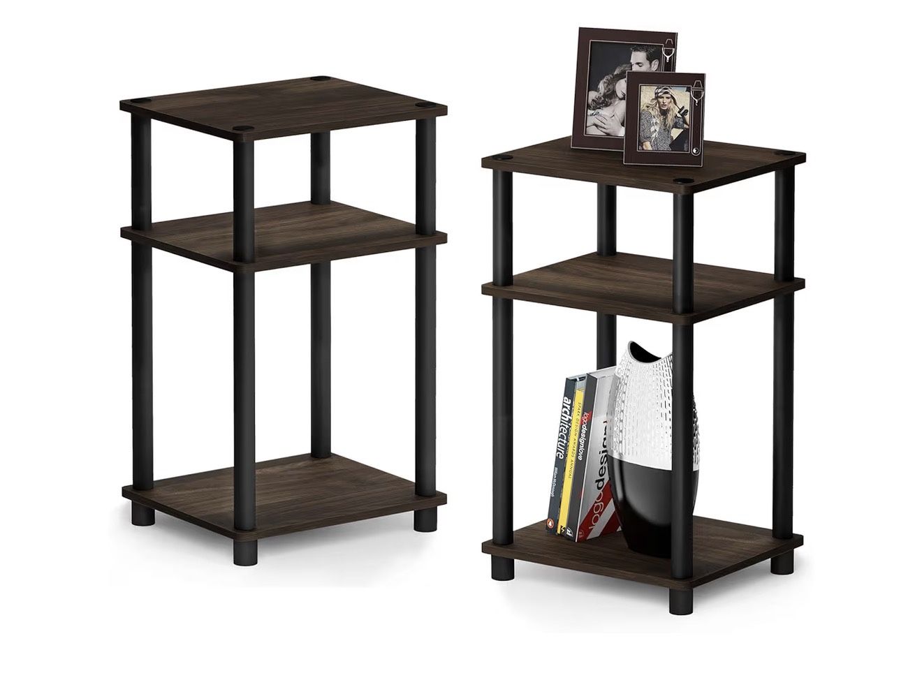 Furinno Just 3-Tier Turn-N-Tube End Table / Side Table / Night Stand / Bedside Table with Plastic Poles, 2-Pack, Columbia Walnut/Black / N21