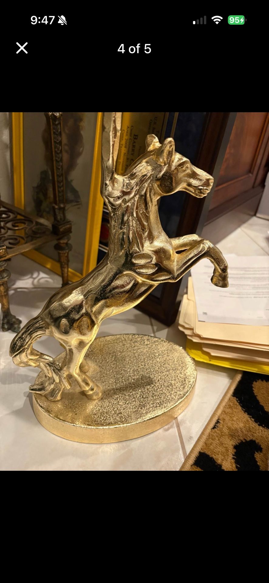 GOLD TONE ALUMINUM OR BRASS & ROUND WHITE MARBLE CAROUSEL HORSE PONY STALLION ACCENT, END, SIDE TABLE $200. Great With Mid Century Modern MCM, Antique, Vintage, Hollywood Regency Glam & Palm Beach Safari Jungle. GOLD Metal peacock and marble table $300. Wood lady Millie the butler maid table $150. Boca 33496,