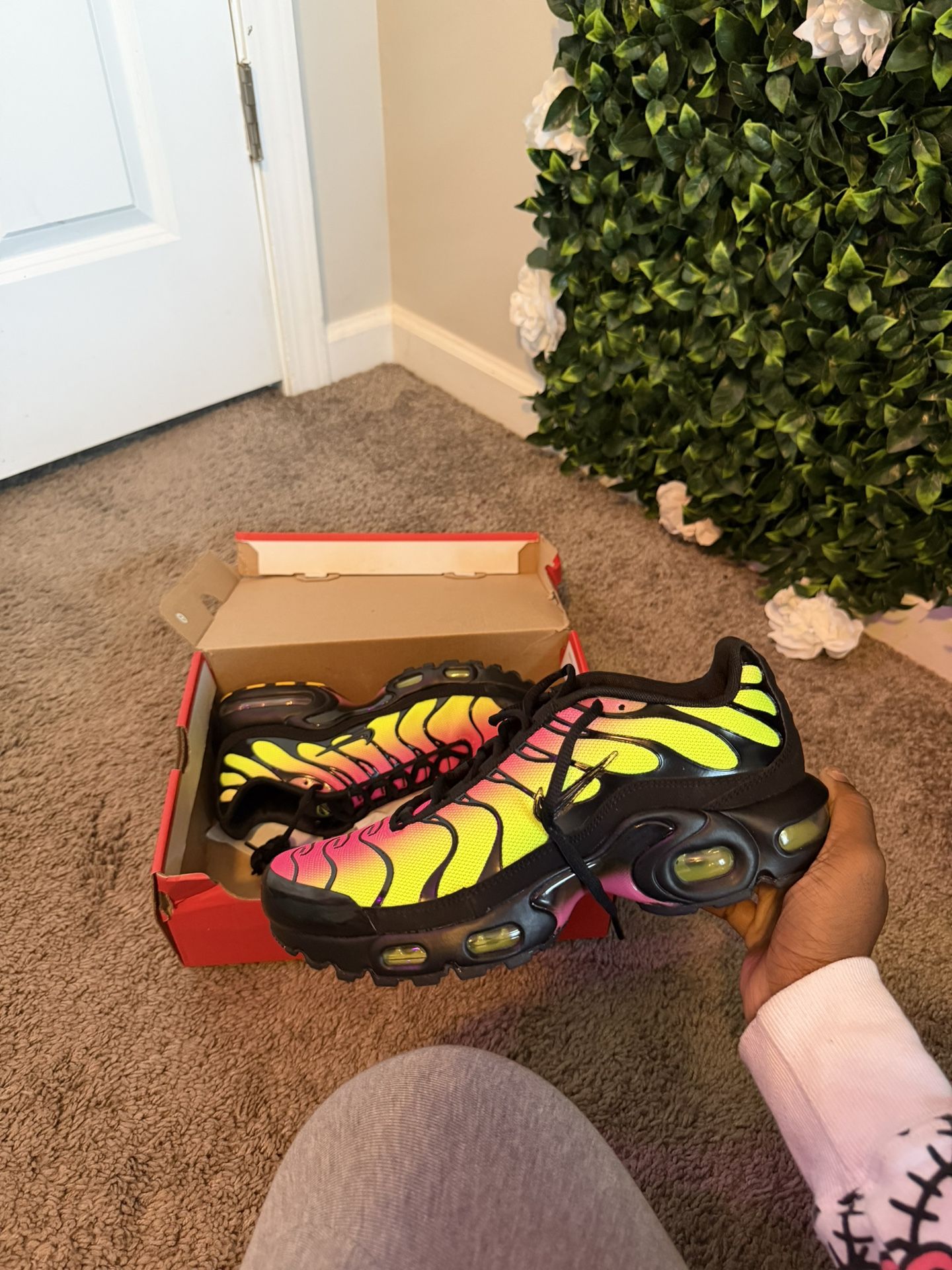 For sale is a brand-new, never-worn pair of Nike Air Max Plus Mercurial XXV in the striking Hyper Pink/Volt/Black colorway This limited-edition release celebrates 25 years of "Tuned Air" and Mercurial football heritage. It features a vibrant yellow-to-pink gradient mesh upper, supported by the iconic black wavy TPU overlays.
