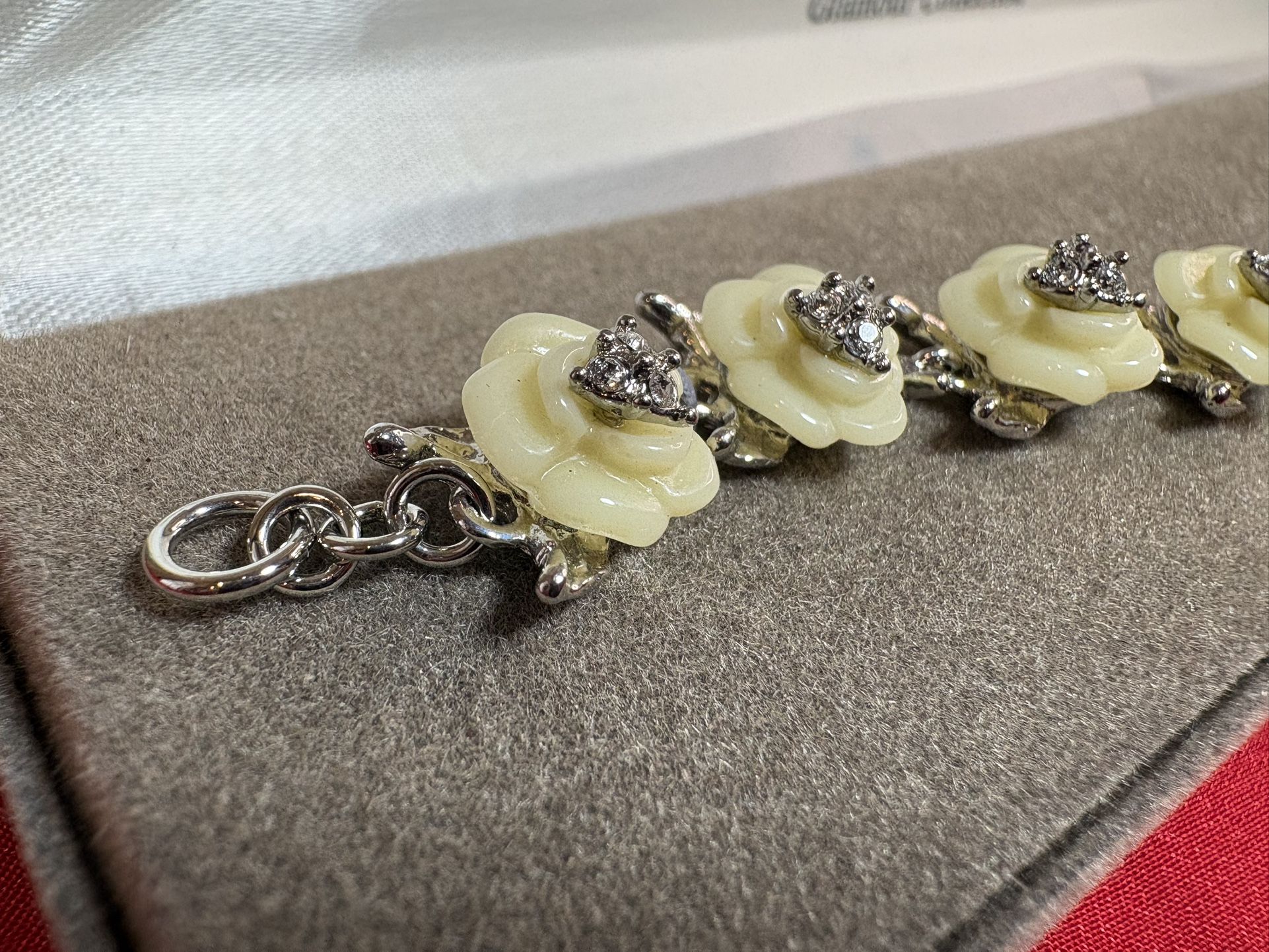 7” ling , 10mm w, about 14gr. * This is a vintage, elegant Nolan Miller "The Glamour Collection" link bracelet. It features a stunning design of white camellia rose flowers crafted from glossy lucite or enamel, centered with sparking rhinestones or crystals. See photos please. The box features a few charming little dot stains, adding a touch of vintage character Thank you.