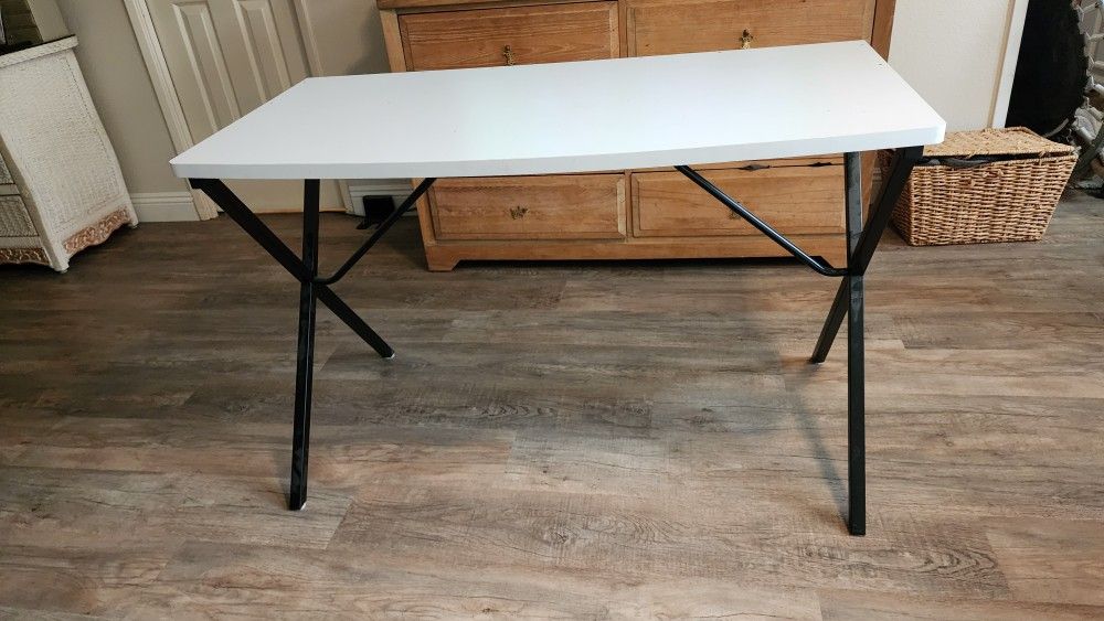 Free. White laminate in good condition. Has holes for back board I no longer have. Left leg is damaged and though it still stands, it will bend when moved if not careful. I've bent it back and continued to use so it still has life as is or legs can be replaced to extend its best life.