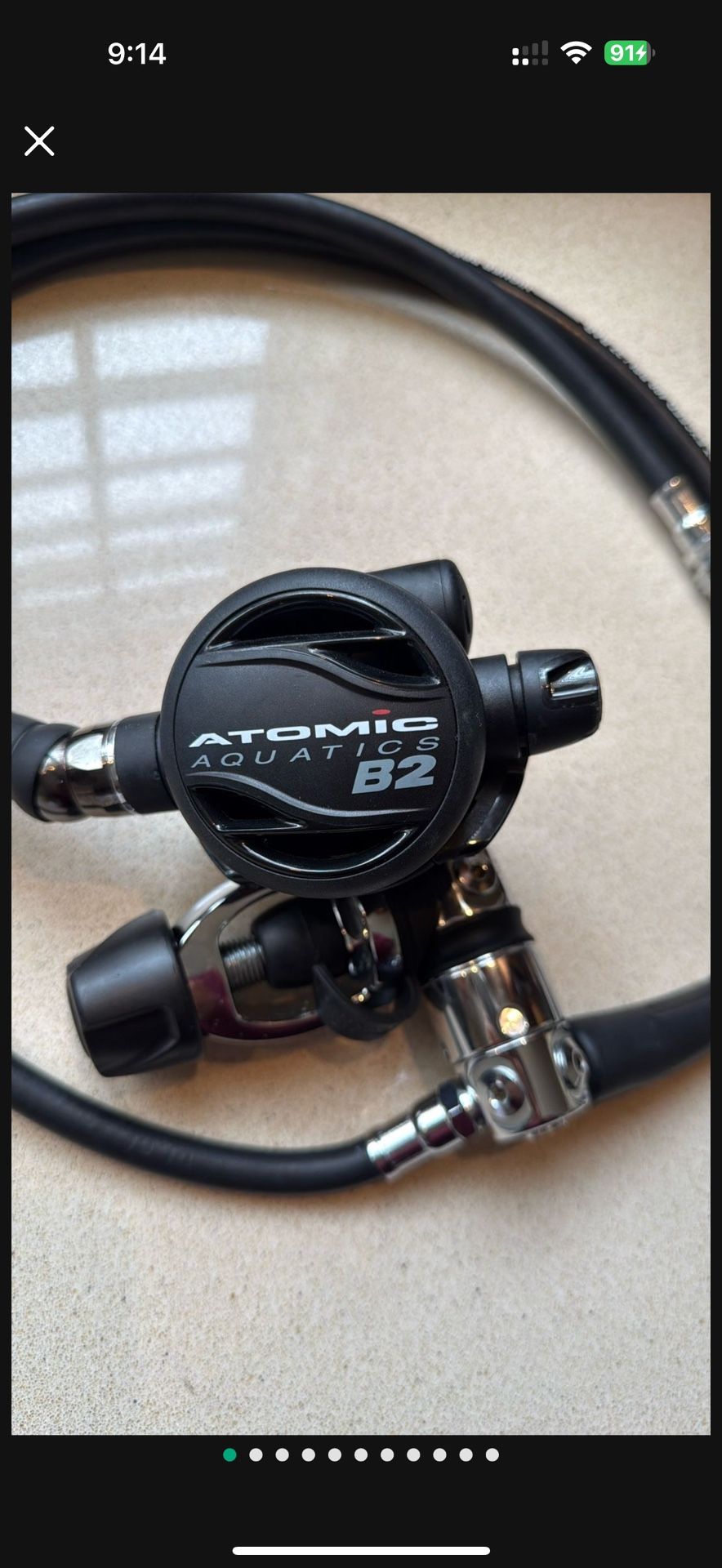 PERFECT VALENTINES GIFT!! First and second stage Atomic B2 regulator in flawless condition. Includes comfort swivel to reduce jaw fatigue, inflator hose, and yoke attachment. This regulator has been used on only two dives and stored in a dry box. Will include original padded Atomic regulator bag if purchased for $535. (As with all scuba equipment, this item should always be inspected and maintained by a certified/authorized scuba dealer.)